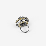 Exquisitely made cz ring; set in a oxidized yellow gold finish.