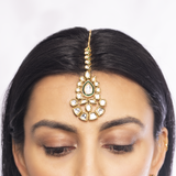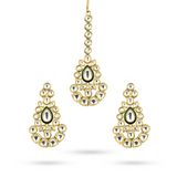 Exquisitely hand made kundan earring and tika set, with green meena and yellow gold finish